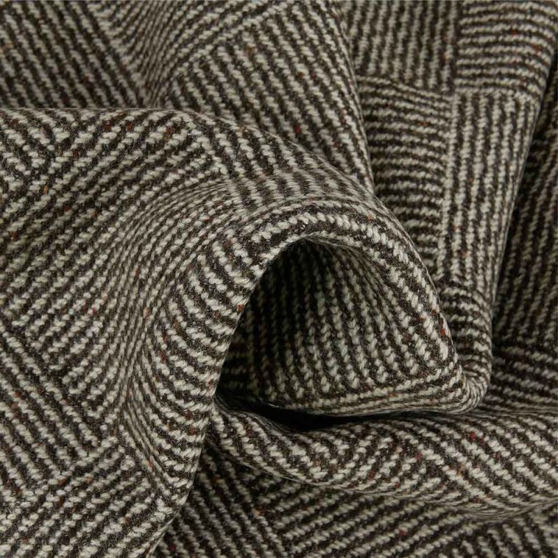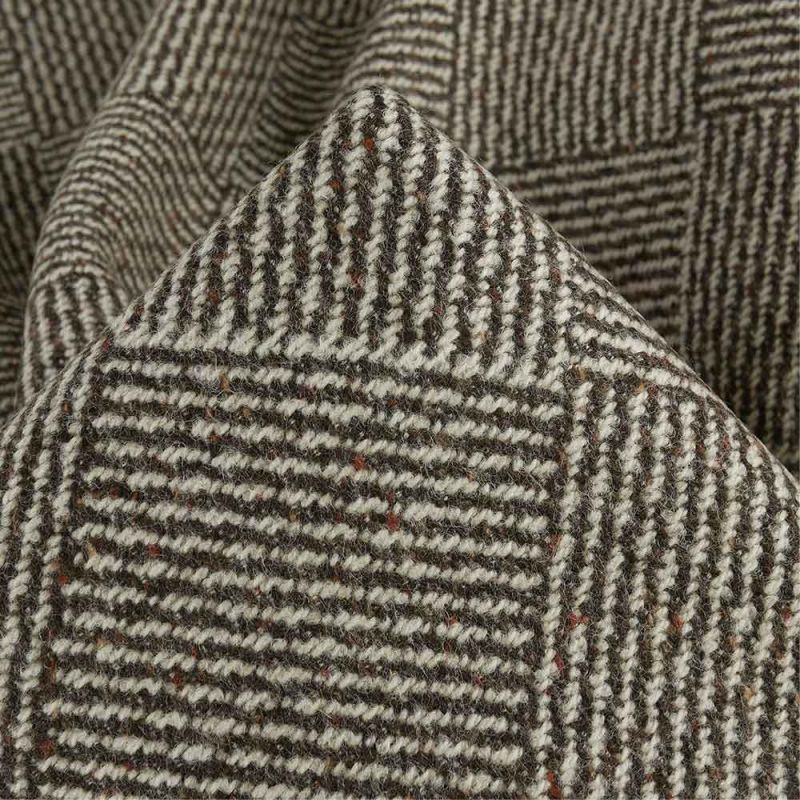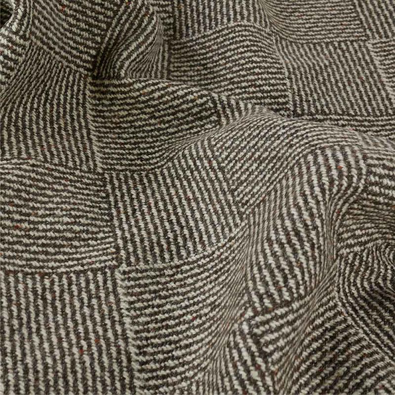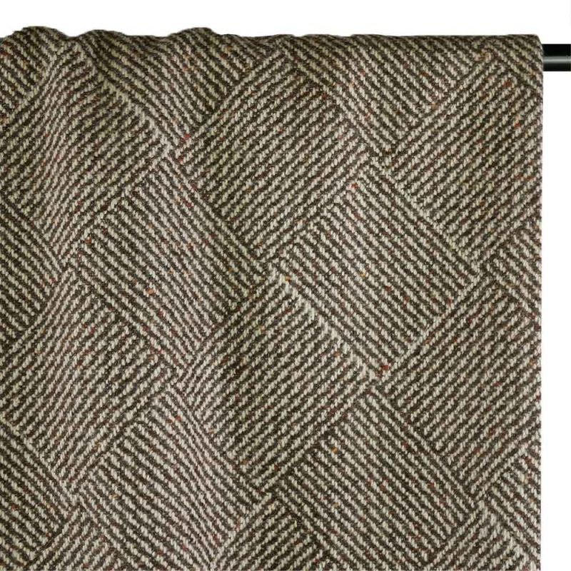 Très beau lainage tweed à l'aspect chiné, composé de laine uniquement. On aime son tissage de fils marrons et écrus, formant un grand motif géométrique à losanges, ou à effet "noué".