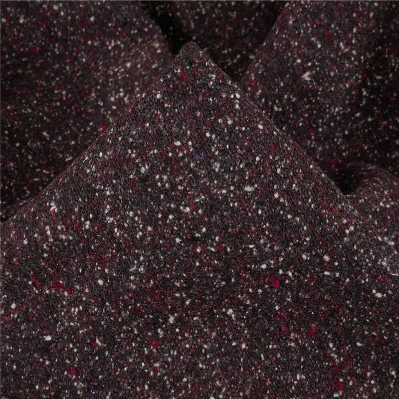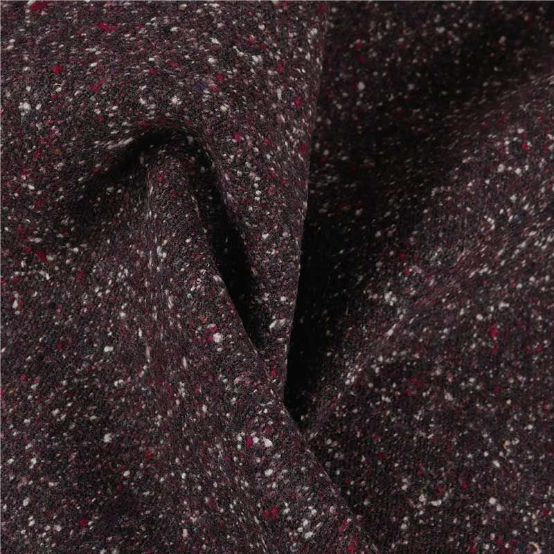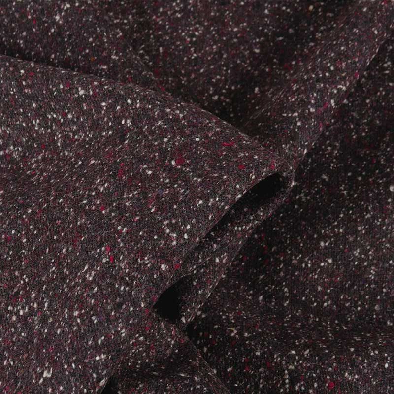 Très beau lainage à l'aspect chiné, principalement composé de laine. On aime sa couleur violet aubergine, à la fois chic et singulière. Ce lainage est tissé à l'aide d'un croisement de fils gris foncés et violets, dans lequel se sont glissés également des petits bruns blancs et rouges.