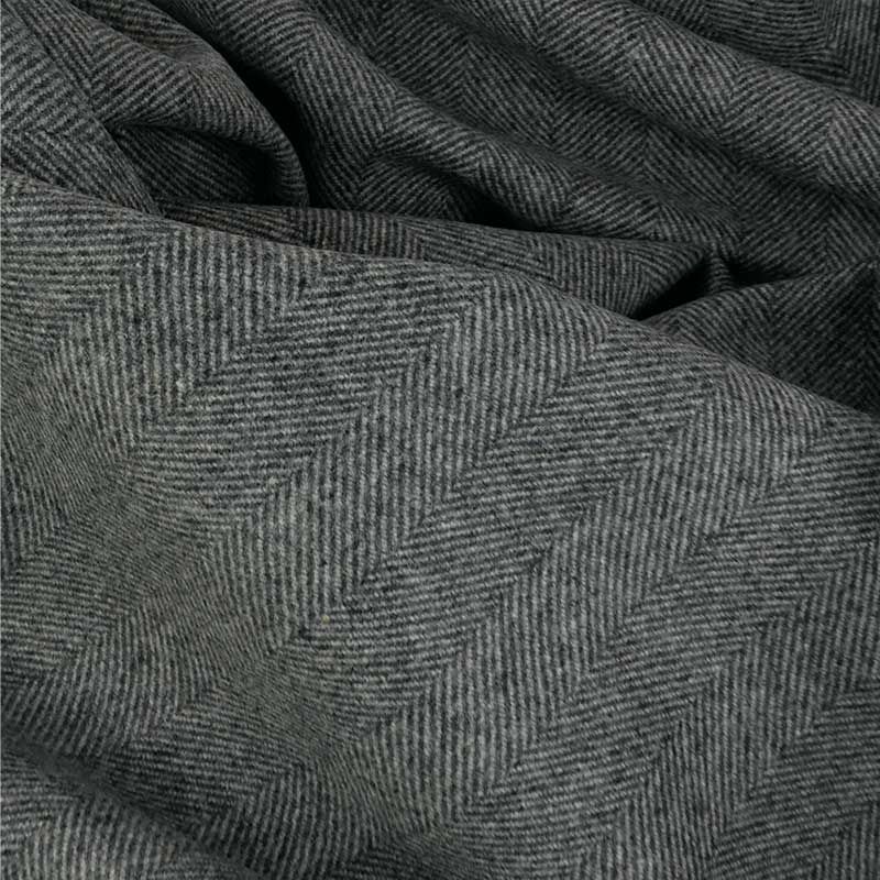 Lainage composé d'un élégant et intemporel motif en chevrons, qui se dessine par l'alternance de fils gris clair et noirs. Ce mélange confère finalement une couleur gris foncé chiné au tissu. Un rendu doux et chaud, parfait pour des pièces de mi-saison.