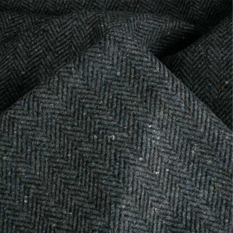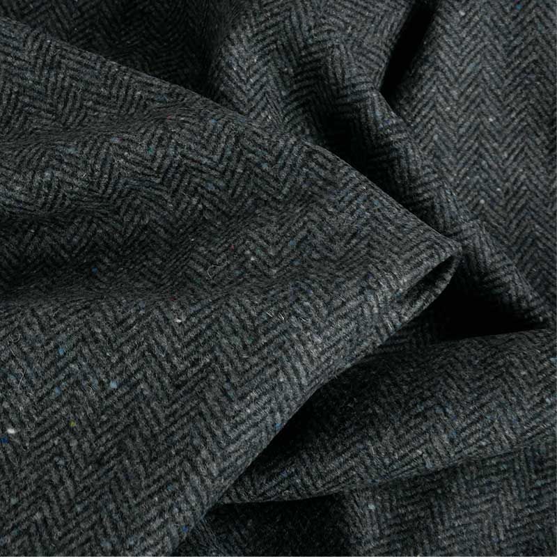Lainage issu d'une fin de stock de haute couture, recouvert d'un discret motif chevrons. Ce dernier est obtenu par un tissage rayé mêlant fils noirs et gris chiné, ponctué de fines touches bleutées esprit tweed.