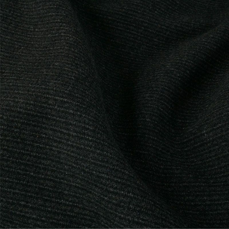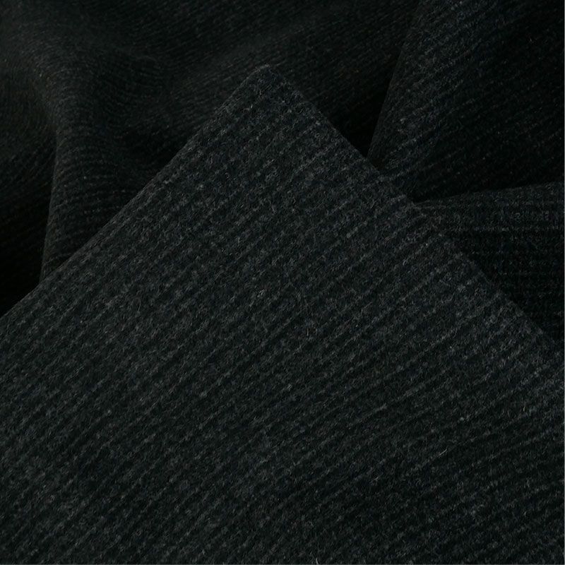 Très beau lainage à fines rayures et à la texture duveteuse. Un drap de laine subtil, qui se démarquera par son discret jeu de rayures grises sur fond gris foncé. Les rayures sont parallèles à la lisière.