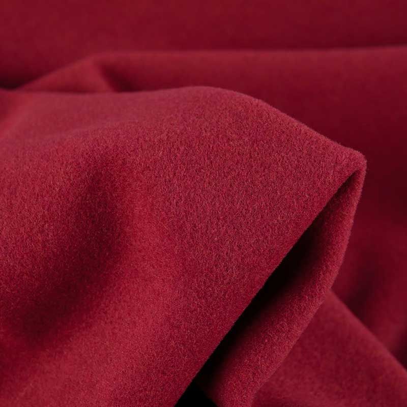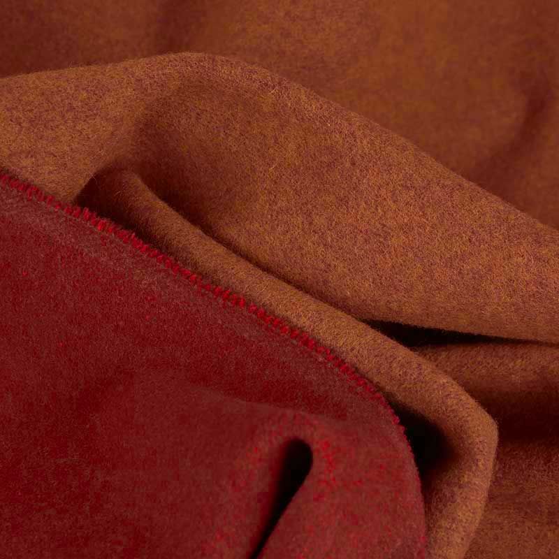 Très beau lainage en laine et cachemire, d'épaisseur moyenne. Son atout : une face endroit rouge carmin, et une face envers orange terracotta. Vous apprécierez la douceur du cachemire sur la face endroit du tissu.