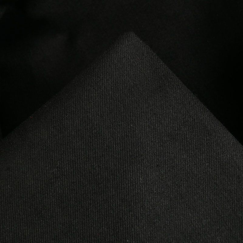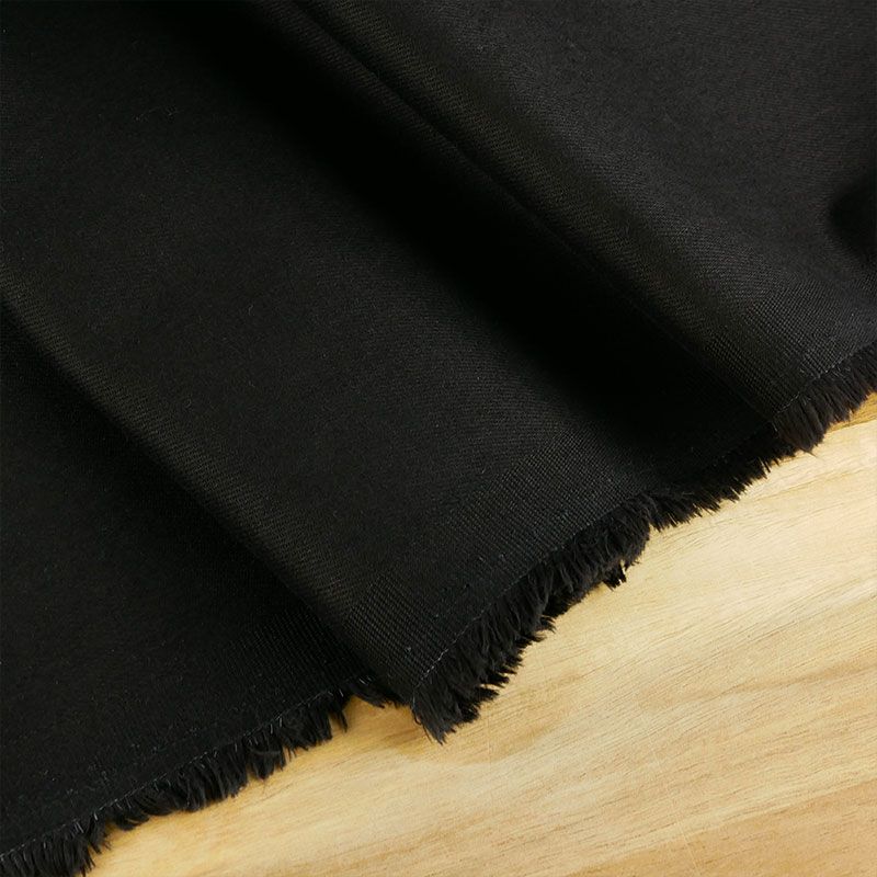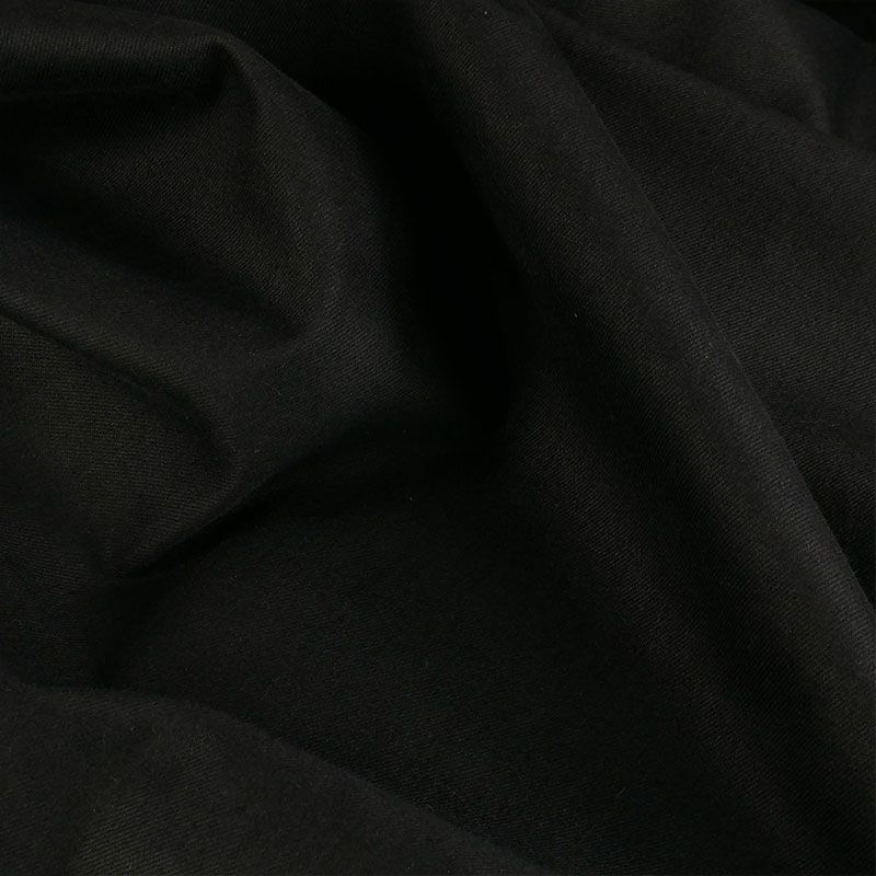 Denim de coton, doté d'élasthanne, ce qui le munit d'une très bonne élasticité. Ce tissu d'épaisseur moyenne, est agréable au toucher et à porter. Un rendu mat, obtenu par l'utilisation de fils noirs pour la chaîne et la trame.