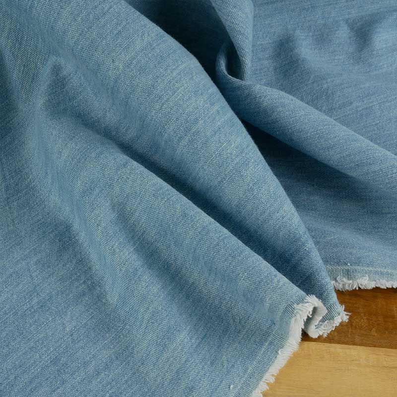 Très beau denim en coton, issu d'une fin de stock de maison de haute couture. On adore sa couleur, un bleu ciel lumineux, parfait pour les beaux jours qui arrivent ! Son tissage irrégulier lui confère un esprit brut.