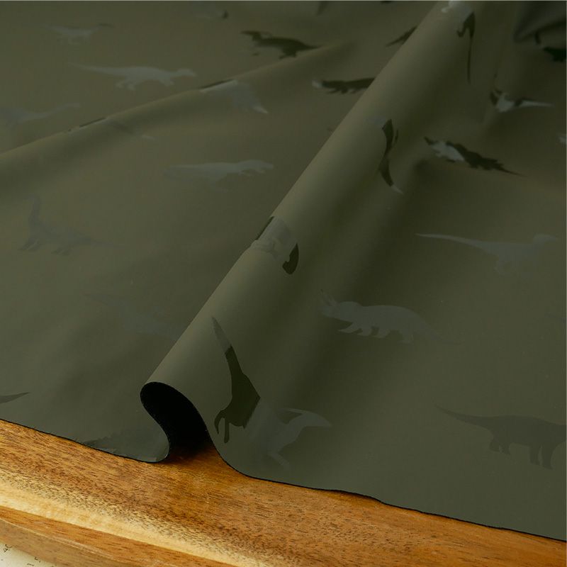 Couvrez-vous avec style, avec ce joli tissu ciré imprimé de dinosaures. Un rendu ton sur ton, discret et original à la fois. Ce tissu imperméable vert kaki, est parfait pour vos créations de mi-saison.