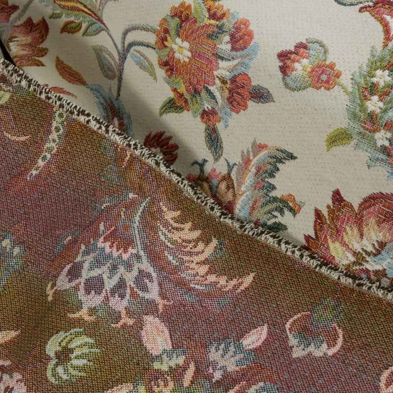 Tel une ancienne tapisserie, ce tissu est décoré d'un magnifique motif fleuri. De grandes fleurs indiennes tissées et remplies de couleurs. Ce tissu jacquard vous promet de véritables chefs d'œuvre à coudre !