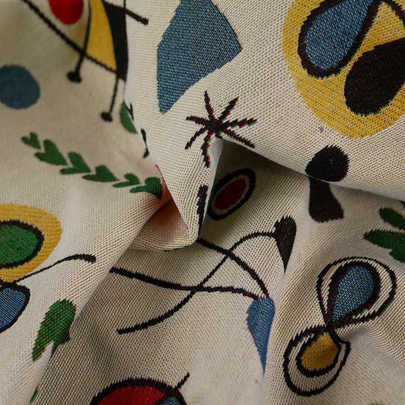 Résolument inspiré des œuvres surréalistes, dont celles de Miró, ce tissu jacquard arbore des motifs abstraits aux couleurs primaires. La couleur de fond est un beige, tissé aux autres fils de couleurs rouge, vert, jaune et bleu.