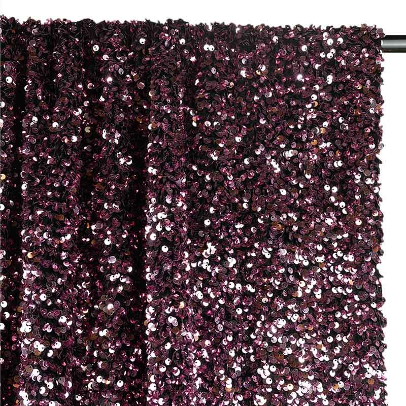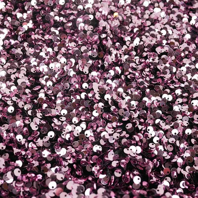 Jersey de velours recouvert d'une pluie de sequins, finement brodés. Les sequins, de couleur rose clair, renvoient la lumière, créant un tissu ultra scintillant.