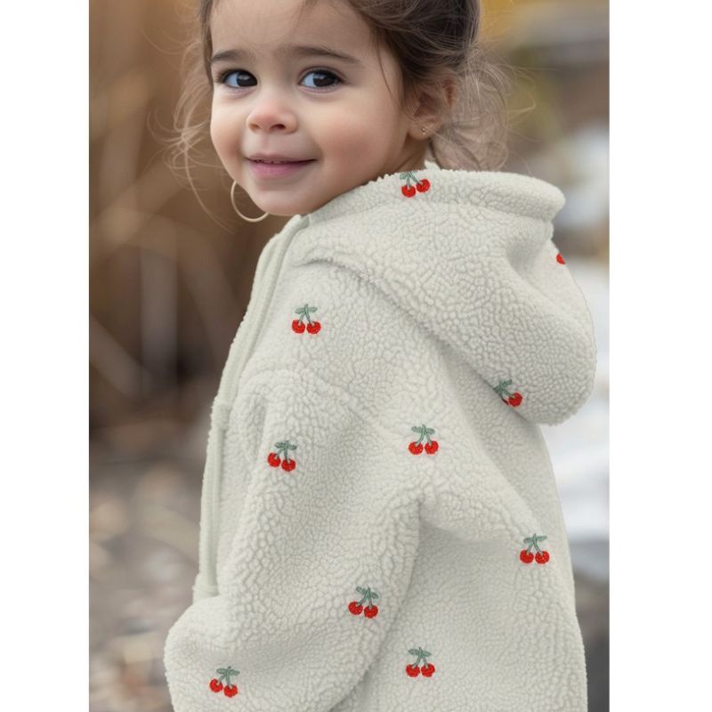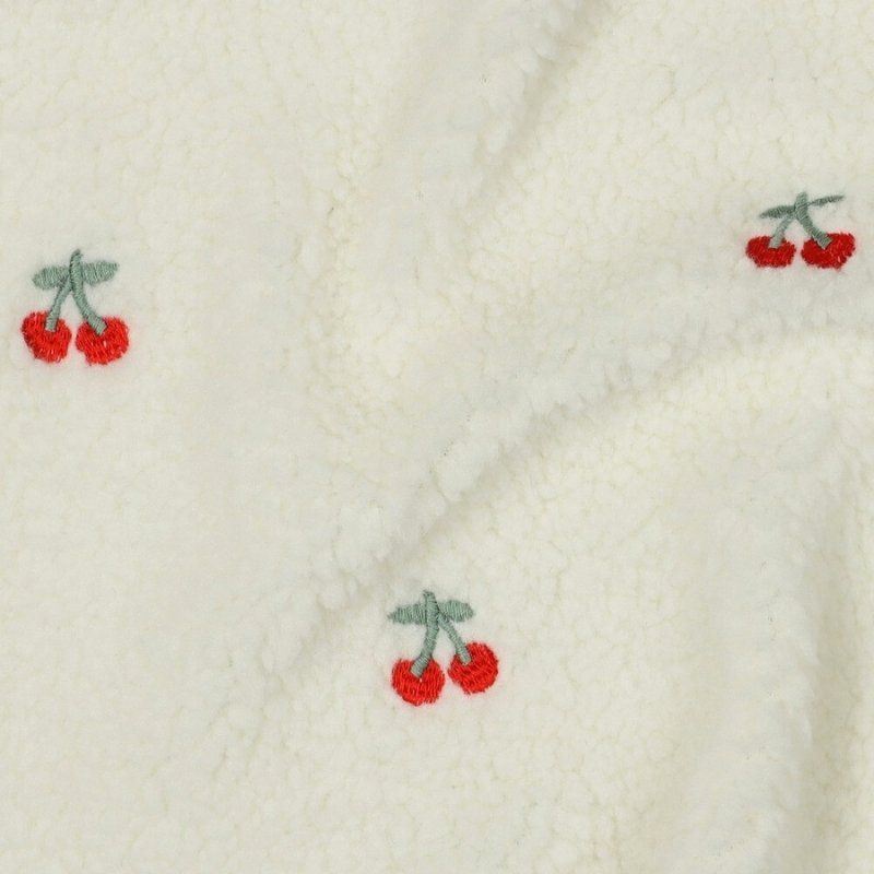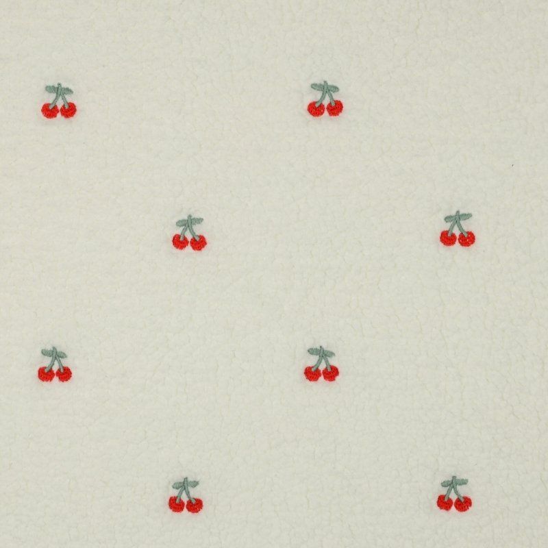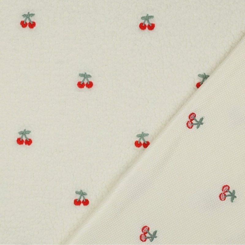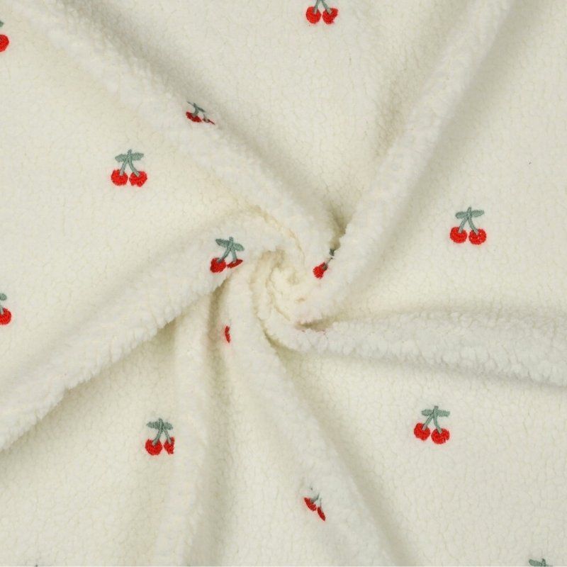 Tissu fausse fourrure sherpa broderie cerises - écru x 10 cm