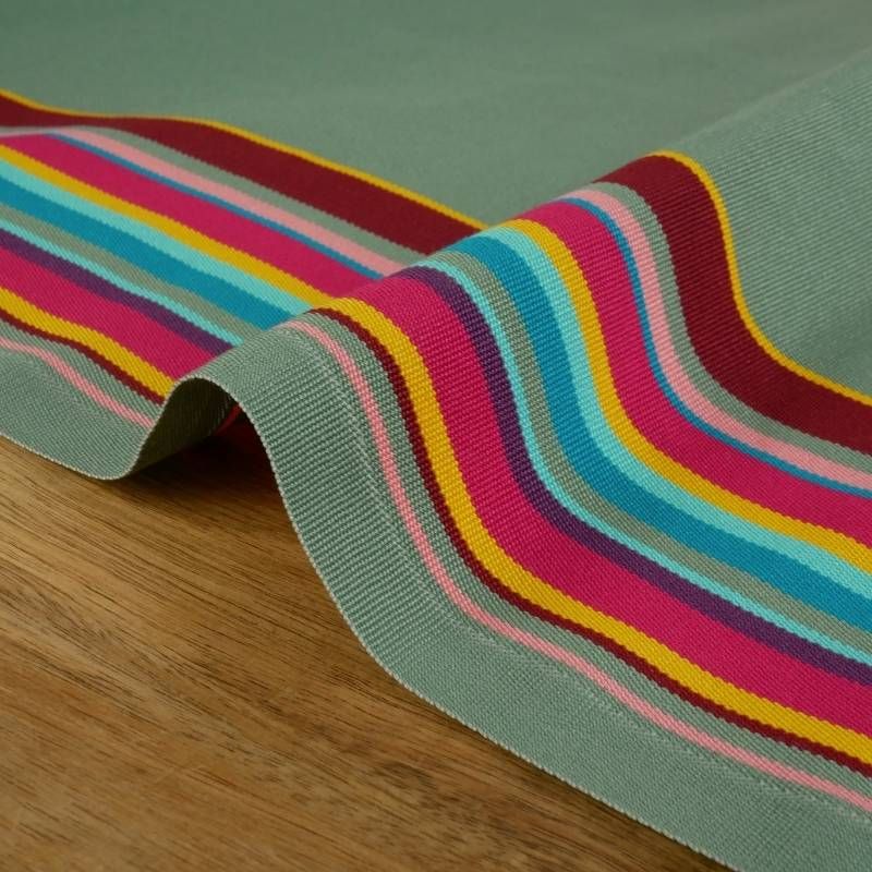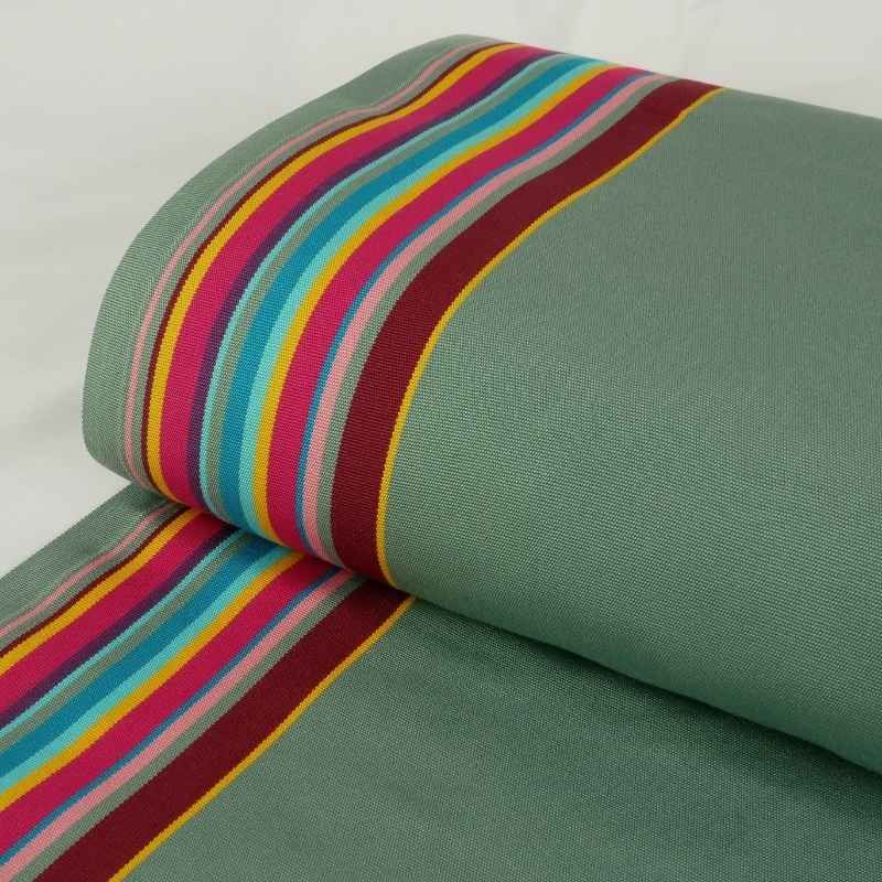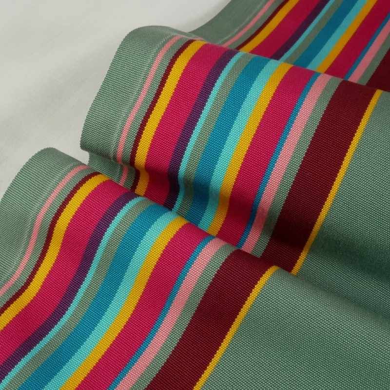 Nouveau tissu ou toile de rachange pour transat, optez pour ces jolies rayures multicolore sur fond vert sauge (deux bandes de lignes multicolore sur les côtés et le centre est vert uni).