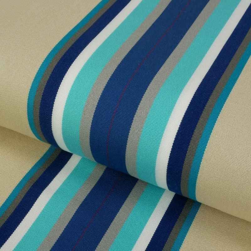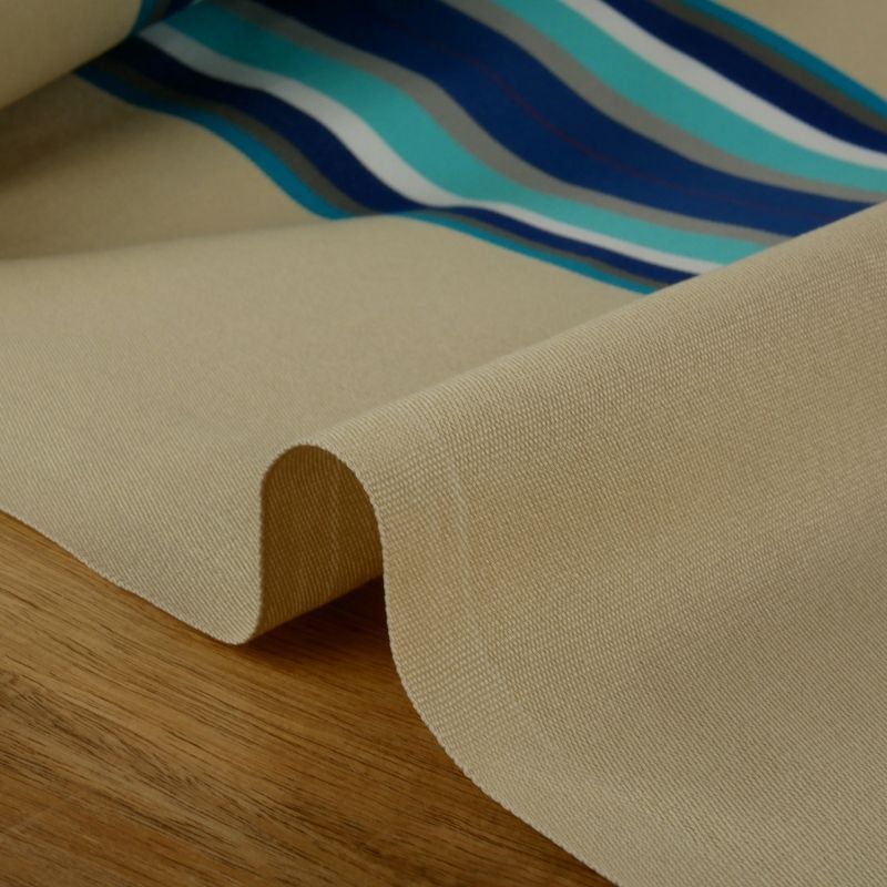 Ce tissu est beige clair, avec des lignes colorées au centre (bleu marine, turquoise, gris et blanc).