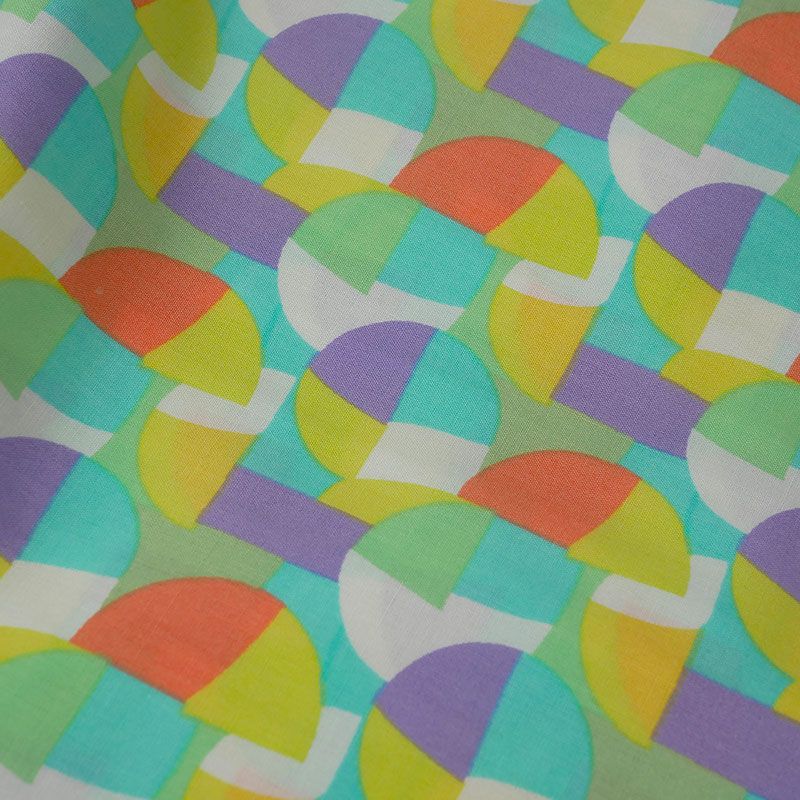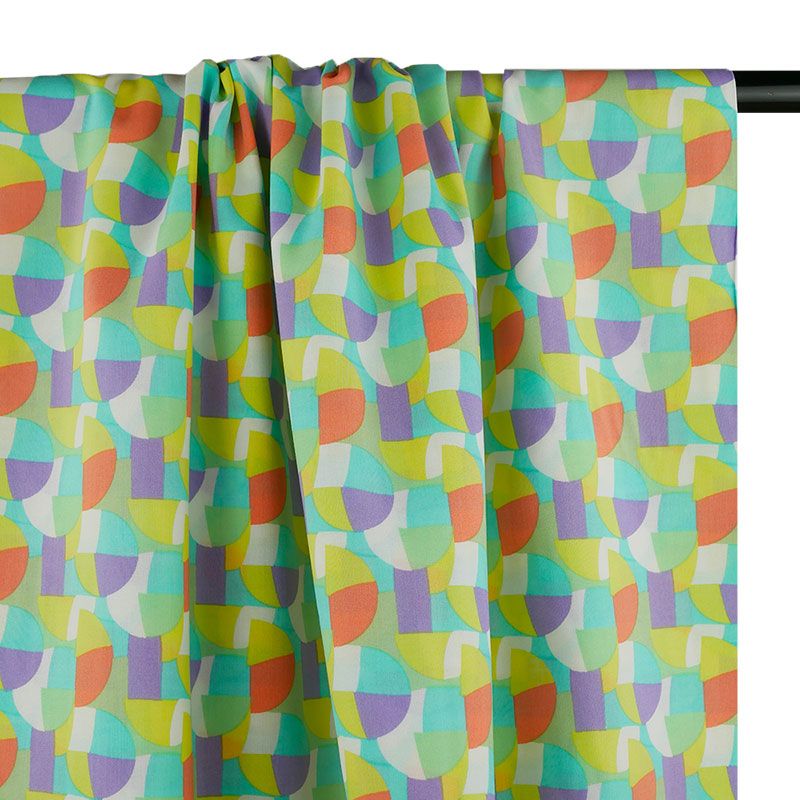Plongez dans la vivacité de l'été avec notre tissu viscose aux motifs géométriques multicolores.