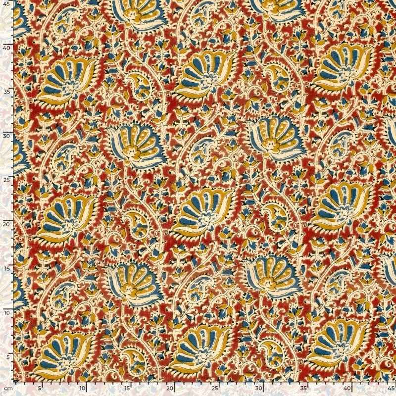 On tombe d'amour pour ce superbe voie de coton, aux couleurs chaleureuses. Un fond soutenu, rouge tomette, recouvert d'une arabesque de motifs végétaux. Inspirés des décors indiens, ces imprimés sont jaune moutarde et bleu.
