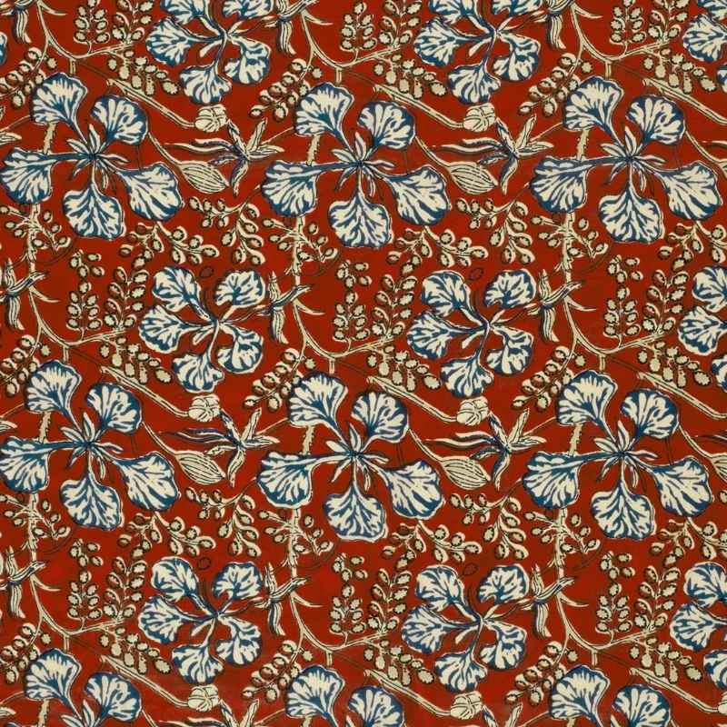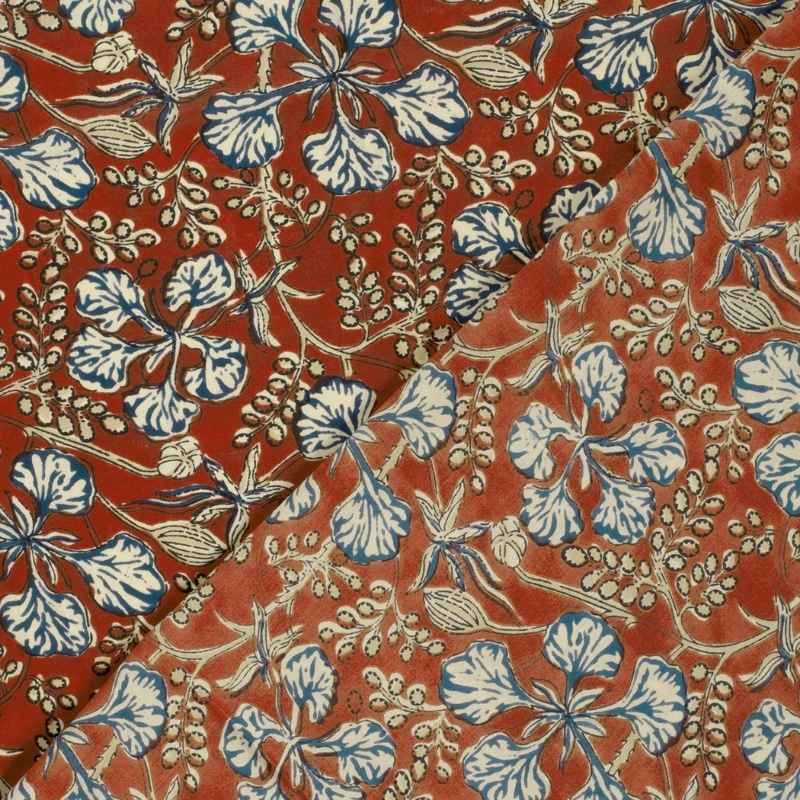 Ce voile de coton tout doux, est tapissé d'un motif végétal et fleuri, bleu marine et écru, sur fond rouge foncé. Inspiré de l'impression batik, ce voile aux notes indiennes, sera du plus bel effet pour vos vêtements légers et accessoires.